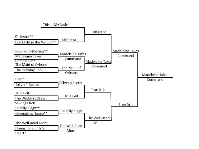 Round 1: I put Bishop Barron's book on the Eucharist in the spot that had no competition. Of the two nonfiction Audible books I zipped through at the beginning of the month, I thought Different was the book that impacted me more and compassionately looks at the lived experiences of a child with a host of difficulties facing him and a parent who walked alongside him as he grew. The two fiction Audible listens from early July resulted in a win for Madeleine Takes Command, even though Paddle-to-the-Sea had its own merits. The suspense of the first book, the plot, and its nuanced look at attitudes and actions of characters from differing races, made it a clear win for me. The book about Joan of Arc beat the outdated and less compelling book about ordinary time feasts and holy days, although I'm glad I read the latter. Pax was fine and probably better written, but I didn't enjoy it as much as Toliver's Secret, the book to which I gave the win. Portis' Western classic blew away its competition, as did J. D. Vance's memoir (no thank you to unexpected supernatural weirdness in cozy children's books!). It was hard for me to decide that last duel, since both books concerned reading and its formative influence. I ended up choosing Marcie Stokman's book since, if only for certain sections, I'm more likely to read it for enjoyment.
